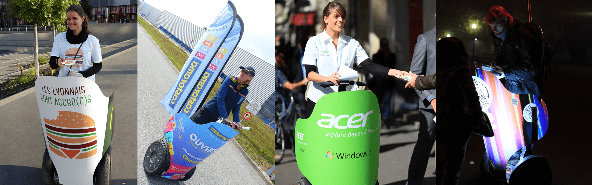 Le gyropode est le moyen le plus utilisé en Street Marketing. On estime que le nombre de Fly distribué par une personne est multiplié par 2, notamment grâce à son allure étonnante et sa grande surface d’affichage.